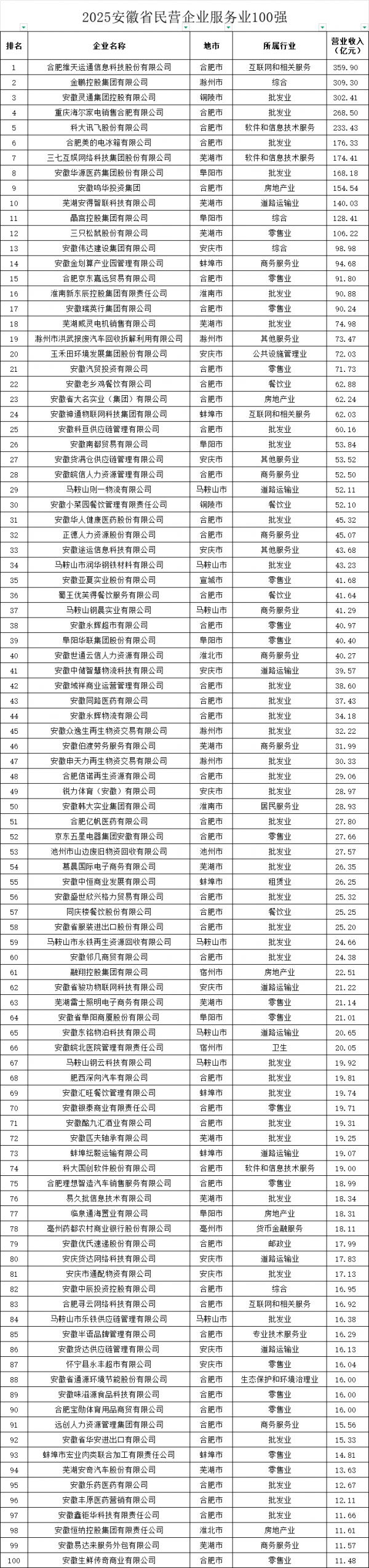 合肥維天運(yùn)通信息科技股份有限公司、金鵬控股集團(tuán)有限公司、安徽靈通集團(tuán)控股有限公司、重慶海爾家電銷售合肥有限公司、科大訊飛股份有限公司位列安徽民營企業(yè)服務(wù)業(yè)百強(qiáng)前五。